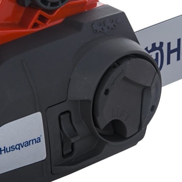 - Система натягу ланцюга реалізована без використання додаткових інструментів. Кришка фіксується зручним маховичком, а регулювання натягу виконується за допомогою спеціального ролика на бічній частині корпусу. Це дає змогу швидко і легко підготувати інструмент до роботи або виконати обслуговування прямо на робочому місці. Заміна шини і ланцюга також проводиться без застосування спеціальних пристосувань, що економить час і підвищує зручність експлуатації.