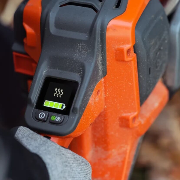 - Система охолодження Husqvarna ActiveCool підтримує оптимальну температуру акумулятора як у процесі роботи, так і під час заряджання. Це сприяє збереженню стабільної продуктивності та збільшує термін служби батарей при інтенсивному навантаженні. Клас захисту IPX4 підтверджує стійкість інструменту до впливу вологи і дозволяє використовувати його в дощову погоду без ризику пошкодження електроніки. Рівень звукового тиску на вухо оператора становить близько 94 дБ(А), що помітно нижчий за показники порівнянних бензинових моделей і робить робочий процес комфортнішим.