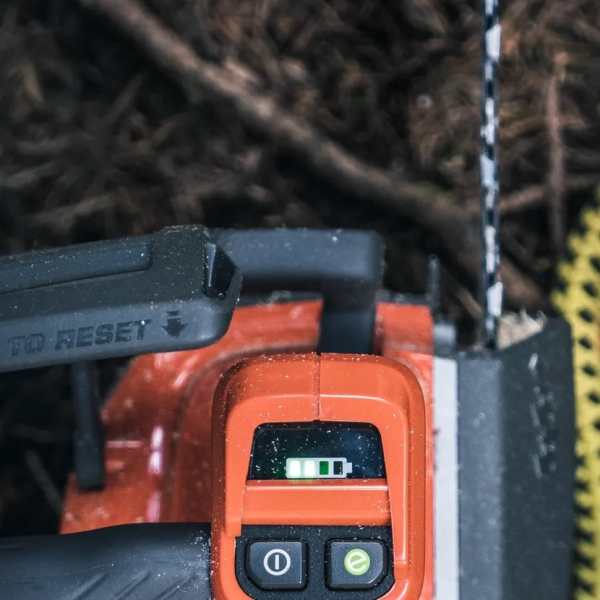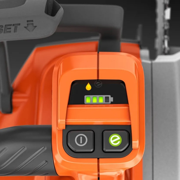 - Номінальна потужність у перерахунку на бензиновий еквівалент становить 1.8 кВт, що дає змогу впевнено працювати з невеликими та середніми деревами, виконуючи плавні та точні пропили. Максимальна швидкість руху ланцюга досягає 24 м/с, а за активації режиму savE — 18 м/с, що дає змогу оптимізувати енергоспоживання за менш вимогливих завдань.