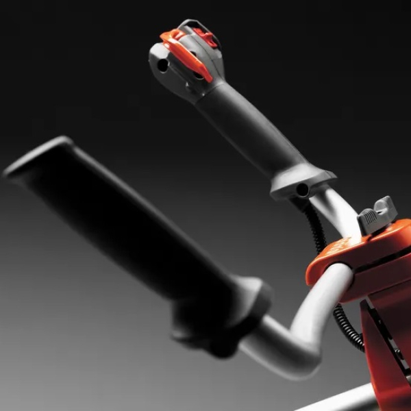 - Особлива увага приділена ергономіці та зручності користувача. Велосипедні рукоятки забезпечують природне положення рук і дозволяють виконувати широкі і точні рухи при косінні. Похила стійка керма і зручні рукоятки покращують контроль над інструментом і зменшують навантаження на руки. Для тривалої роботи передбачена професійна підвіска Balance 55, яка рівномірно розподіляє вагу інструменту на плечі, груди і спину оператора, значно знижуючи втому навіть при багатогодинній експлуатації.