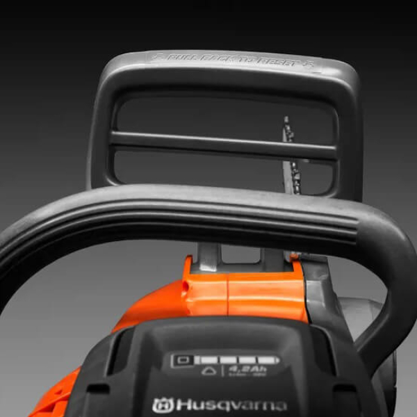 - Для підвищення безпеки передбачено ефективне інерційне гальмо ланцюга, яке миттєво зупиняє ланцюг у разі виникнення віддачі, знижуючи ризик травмування. Конструкція захисного щитка покращує огляд кінчика шини і забезпечує кращий контроль над процесом пиляння. Додатковим заходом безпеки слугує функція автоматичного вимкнення — якщо інструмент залишається без нагляду, він самостійно вимикається, подовжуючи термін служби акумулятора і зменшуючи ймовірність нещасних випадків.