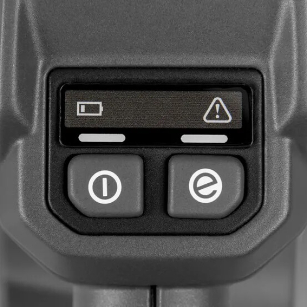 - Рівень звукового тиску на вухо оператора становить 89 дБ(А), що значно нижче порівняно з бензиновими аналогами. Низький рівень шуму робить роботу комфортнішою і дає змогу використовувати інструмент у житлових районах без зайвого дискомфорту для оточуючих. Зручна панель управління з міцними кнопками та світлодіодними індикаторами дає змогу легко контролювати стан заряду акумулятора та обирати оптимальний режим роботи.