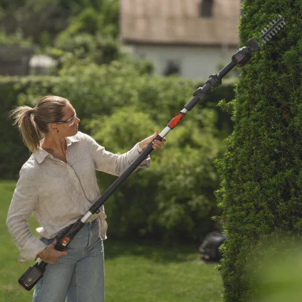 - Додаткова телескопічна штанга розширює радіус роботи кущоріза, даючи змогу виконувати обрізання на висоті до 3 метрів і забезпечуючи більш зручне, ергономічне положення користувача під час роботи.