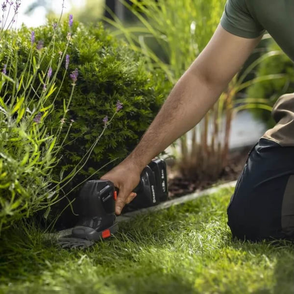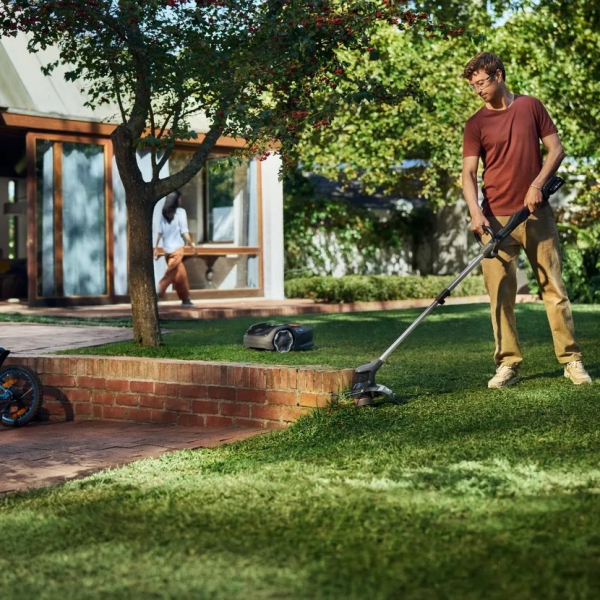 - D-подібне руків'я з м'якими накладками підвищує контроль і комфорт під час тривалої роботи, а добре збалансований корпус з масою лише близько 2.6 кг без акумулятора робить пристрій легким і маневреним. Металевий захисний кожух запобігає пошкодженню рослин і перешкод під час точної обробки країв, забезпечуючи акуратний результат навіть поблизу декоративних елементів ландшафту.