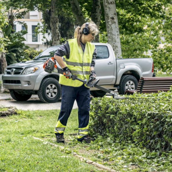 - Модель поєднує потужний бензиновий двигун, подовжену конструкцію і високоякісний ріжучий механізм, що дозволяє ефективно підстригати високі, широкі та густі живоплоти без використання драбини або підйомного обладнання.