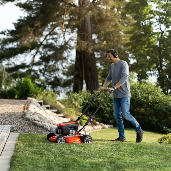 - Ширина захвату 44 см дозволяє швидко проходити відкриті ділянки і в той же час залишає косарку досить маневреною для роботи між клумбами, деревами або садовими доріжками.
