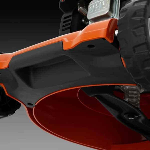 - Корпус газонокосарки виготовлений з композитного матеріалу, що поєднує легкість і міцність конструкції.