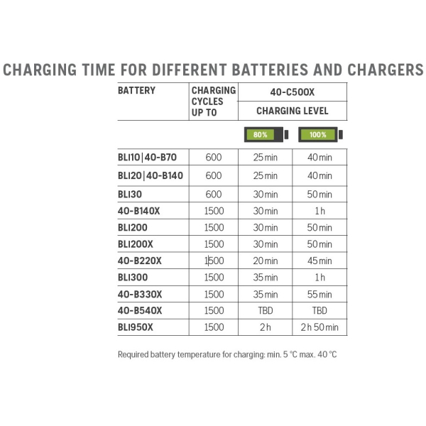 - Модель сумісна з широким спектром акумуляторів системи BLi-X, включаючи моделі BLi10/40-B70, BLi20/40-B140, BLi30, BLi100, BLi200, BLi200X, BLi300 і ранцевий акумулятор BLi950X. Час заряджання залежить від ємності батареї: наприклад, акумулятор BLi10 заряджається приблизно до 80% за 25 хвилин і повністю приблизно за 40 хвилин, тоді як потужний ранцевий акумулятор BLi950X досягає 80% заряду приблизно за 120 хвилин, а повний цикл займає близько 170 хвилин.