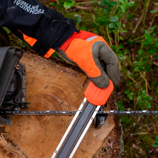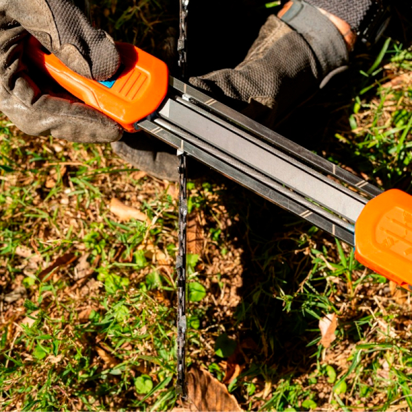 - Система 2-в-1 поєднує круглий напилок (4.8 мм) для заточування ріжучих зубців і плоский напилок для одночасного підточування обмежувача глибини. Завдяки правильному куту подачі інструмент автоматично витримує оптимальну геометрію зубця — навіть якщо у вас немає великого досвіду заточування.